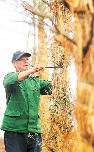 2月22日,在海口市滨江路绿化带,工人用稻草把刚栽种的小叶榄树干裹好,给新树穿上“保湿衣”,以降低其水分的蒸发度。 本报记者 李英挺 摄