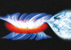 美国航天局2月21日宣布,天文学家利用钱德拉X射线太空望远镜观测到源自恒星质量黑洞、迄今移动速度最快的宇宙风,这对理解此类黑洞的运行具有重要意义。这一创纪录的风源自恒星质量黑洞IGR J17091周围的气体盘,速度达到每小时2000万英里(约3200万公里),大约是光速的3%。 这张美国航天局2月21日公布的假想图显示,恒星质量黑洞IGR J17091(左)从邻近星球吸取气,在黑洞周围形成热气体盘,强大的风从气体盘吹出。 新华社发
