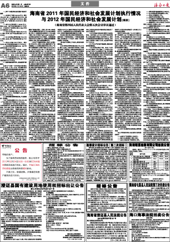 海南省2011年国民经济和社会发展计划执行情况与2012年国民经济和社会发展计划(摘要)