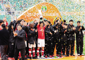 2月25日,在广州进行的2012中国足协超级杯比赛中,广州恒大队以2:1战胜天津泰达队,捧得超级杯。图为恒大队球员在颁奖仪式上。 新华社发