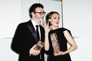 | 《艺术家》导演米歇尔·哈扎纳维西乌斯(左)和主演贝蕾尼斯·贝若夫妇手捧奖杯。