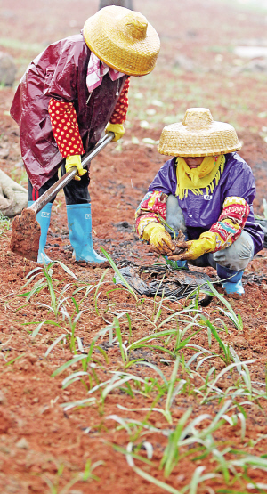 → 春雨绵绵,正是植树绿化好时节。2月26日,小雨中,海口市琼山区南渡江畔活跃着工人种花植树的忙碌身影。 本报记者 李英挺 摄
