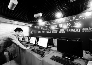 2月26日,在全国两会新闻中心电信网络服务室,工作人员在调试网络。 当日,设在北京西长安街北侧梅地亚中心的全国两会新闻中心正式开展工作。十一届全国人大五次会议和全国政协十一届五次会议将分别于3月5日和3月3日在北京开幕。 新华社记者 燕雁 摄