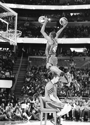 | 埃文斯表演跨人双球扣篮。 新华社发 |