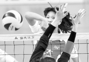 2月28日,2011-2012赛季全国女排联赛总决赛首场比赛在上海举行,上海女排主场1:3不敌广州女排。图为广州女排队员尹萌(后)三号位快攻。 新华社发