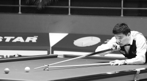 28日,丁俊晖在比赛中。 本报记者 宋国强 摄
