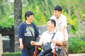 | 2月28日,青年志愿者程志彬推着来自南京的残疾游客冯先生在欣赏三亚湾国光豪生度假酒店的热带园林。 本报记者 苏建强 摄 |