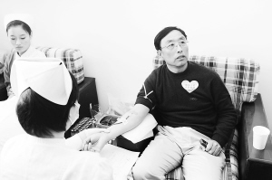 | 2012年2月27日,郭明义(右一)在空军总医院献血。 |
