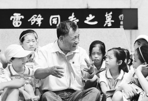 | 2009年7月29日,雷锋生前战友乔安山(中)在坐落在抚顺市的雷锋纪念馆雷锋墓前向天津南开区中营小学的“学雷锋小标兵”讲述雷锋生前的先进事迹。 |