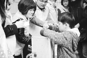 | 2012年2月12日,“爱从头开始 十万火急救碧心”义剪筹款活动在广州举行,为11岁的广州白血病女孩刘碧心捐款。一名小朋友在活动现场为小碧心捐款。 (本版照片均由新华社发) |