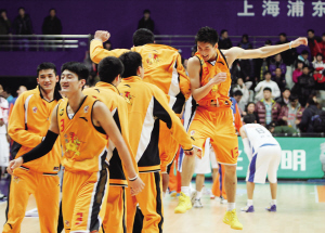 2月29日,在CBA季后赛首轮第四回合比赛中,山西队客场以121:114战胜上海队,晋级四强。 图为山西队球员庆祝胜利。 新华社发