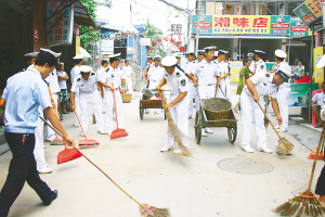 日前,人民解放军海军驻三亚某部来到共建单位下洋田社区开展学雷锋活动,与青年志愿者一起打扫卫生,看望孤寡老人。数十年的共建合作,军民建立了鱼水深情。 本报记者 苏建强 通讯员 张信涛 摄
