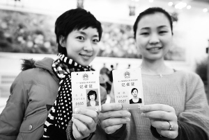 | 3月1日,两名参加十一届全国人大五次会议报道的记者在人民大会堂里展示刚刚领取的记者证。 |