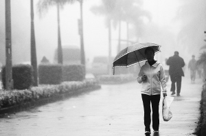 海口: 又见浓雾 3月1日上午,海口被浓雾笼罩,行人撑伞行走在潮湿的马路上。 本报记者 张杰 摄