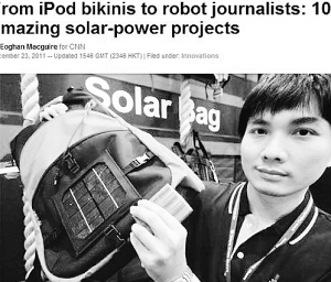 这种太阳能背包装配有锂电池,可以在运动中为手机、MP3播放器和其他电子产品充电。类似的概念近年来也有开发,包括为笔记本电脑充电。 (来源:国际在线)