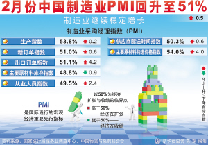 据新华网上海3月1日电(记者桑彤华晔迪)中国物流与采购联合会1日公布的最新数据显示,2月份中国制造业采购经理指数(PMI)为51.0%,较上月回升0.5个百分点,连续第三个月回升,并创下五个月新高,显示当前市场需求有所扩张,生产经营活动趋于活跃,制造业经济整体呈现“稳中趋升”态势。