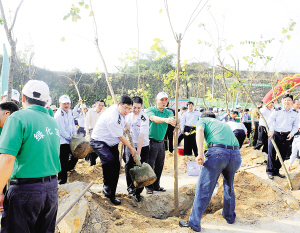 誓师大会暨“生态环境保护协会”成立大会后,来自全县机关干部、企事业单位职工、农场工人、学校师生、部队官兵以及各乡镇副科级以上干部3000余人,汇集保亭县城西环路,开展植树造林活动(见下图,特约记者黄青文摄)。包括教育系统和税务部门前几天种植的树木,全县已经种植树木1万多株,树种包括黄槐、大叶紫薇、洋紫荆、白玉兰、火焰树和重阳木等。