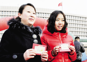 | 3月1日,内蒙古自治区鄂尔多斯市两位居民在向媒体展示刚刚领到手中的“居民健康卡”。 新华社记者 李利军 摄 |