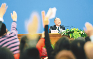 | 3月4日,十一届全国人大五次会议新闻发布会上,大会发言人李肇星介绍本次会议的有关情况,并回答中外记者的提问。 本报特派记者 王凯 摄 |