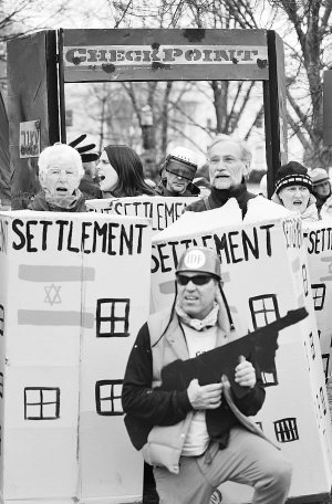3月5日,在美国首都华盛顿白宫外,示威者在抗议中模仿犹太人定居点与以军检查站。 正当美国总统奥巴马5日在华盛顿会见来访的以色列总理内塔尼亚胡之时,上百名反战示威者聚集白宫外,呼吁美国不要对伊朗实施军事打击,也不要支持以色列可能对伊朗发动的袭击。 新华社记者 王轶欧 摄