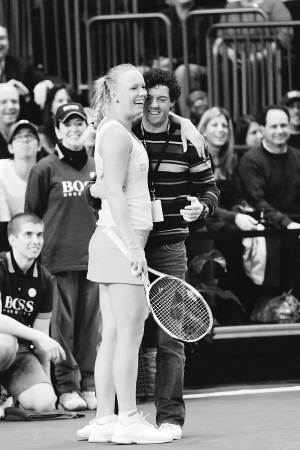 3月6日,在纽约进行的巴黎银行杯网球表演赛中,丹麦选手沃兹尼亚奇以0:2不敌俄罗斯选手莎拉波娃。图为沃兹尼亚奇的男友、高尔夫球世界第一麦克罗伊(右)来到现场为女友助阵。 新华社发