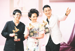 | 《桃姐》导演许鞍华(左)和主演叶德娴(中)、刘德华在北京首映式上 新华社发 |