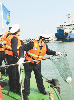 →海事青年志愿者在清理海口港港池内的垃圾。 通讯员 汪蓓 摄
