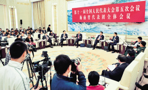| 3月7日,海南代表团在北京人民大会堂海南厅召开全体会议以及举行海南团开放团组活动。 本报特派记者 王凯 摄 |
