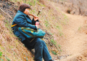 3月7日,赵明翠在投递路上吃自带的饼子。