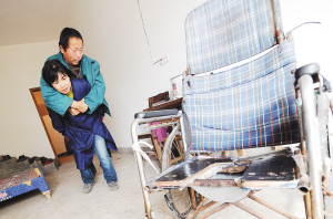 3月7日,欧阳爱珍背着丈夫坐上轮椅。