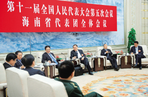 | 3月9日,中共中央政治局常委李长春参加海南代表团的审议。 本报特派记者 王凯 摄 |
