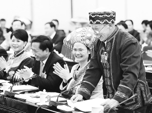 3月9日,在十一届全国人大五次会议广西代表团会议上,广西资源县两水苗族乡社水村村委会主任杨盛川代表在发言后,特地唱了一首苗族歌曲赞扬党的好政策。 新华社记者 刘建生 摄