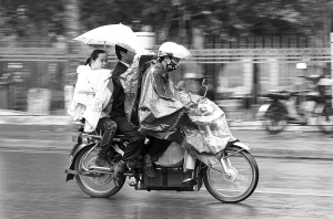 3月9日,海口市气温骤降,绵绵细雨中,急于赶路的行人,在摩托车电单车上,或单手撑伞,或“结伴”超载,更有甚者,年轻夫妻在摩托车上怀抱婴儿冒雨疾驰,家长让孩子蹲坐电单车上飞奔回家……冷雨天里,有着普通百姓日常生活中的温情,更有隐患重重的交通“险情”。 本报记者 张杰 摄
