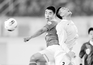 | 恒大队球员赵旭日(左)与申鑫队球员李磊争顶。 新华社发 |