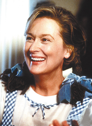 最近读书,看到一句明朝画家文征明的话:“命不可枉,时不可忽。人生实难,不勤何获?”梅丽尔曾在访谈中对水均益说:“即使最完美的生命,也会有疾病,有死亡,也会有失去,有你无法改变的现实。”那是在她父母双双亡故之后的感悟。她的身上,最能体现的是“勤”,是力求与角色合而为一的契合。银幕上各式各样的女人,敏感纤细如苏菲,细腻温情如弗兰西斯卡,刚强如凯伦,时尚如“女王”,强硬如铁娘子,爽朗如朱莉娅……一串串的名字,我相信,依旧会精彩地延续下去。