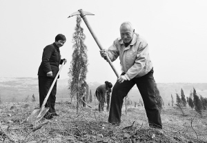 璩正茂老人在种树时,老伴就是他的“眼睛”,老伴把他的锄头放在哪儿,老璩就在哪儿开始挖坑(3月10日摄)。