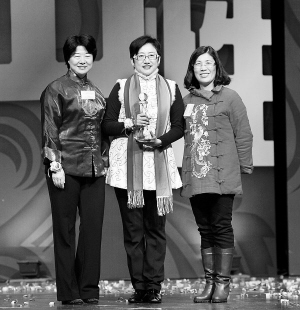 3月11日,获奖者郑臻(中)在颁奖仪式上。 当日,为纪念第102个“三八”国际劳动妇女节,由香港妇女联合会举办的“杰出女性2012”颁奖礼在香港举行。在香港各领域有突出贡献的8名妇女获得杰出女性大奖。 新华社记者 陈晓伟 摄