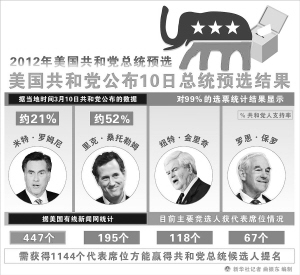 据新华社华盛顿3月10日电(记者王丰丰 杜静)美国堪萨斯州共和党人10日举行总统预选,前宾夕法尼亚州参议员里克·桑托勒姆赢得预选。同一天,前马萨诸塞州州长米特·罗姆尼在关岛与北马里亚纳群岛的预选中获胜。 根据美国有线新闻网统计,当前罗姆尼赢得447名共和党全国代表大会代表,桑托勒姆排名第二,赢得195名。前众议院议长纽特·金里奇和得克萨斯州众议员罗恩·保罗分别赢得118名与67名。