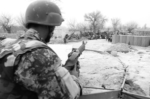 | 3月11日,在阿富汗坎大哈省,阿富汗民众聚集在一座美军防卫塔周围,一名美军士兵在塔内警戒。 新华社/美联