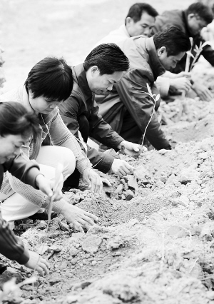 | 3月12日,陵水黎族自治县本号镇干部职工在公路旁精心栽下5000多株马占相思绿化树苗。 本报记者 李英挺 通讯员 黄艳艳 摄 |