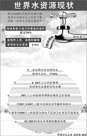 报告指出,到2015年,世界发展中地区86%的人口将可以获得相对安全的饮用水,距离联合国制定88%的千年目标还有一定距离,届时仍有近10亿人口无法获得安全饮用水。卫生基础设施发展落后于城市人口增速,全球约80%的废水仍未能得到收集和处理。此外,农业用水已占淡水使用的70%,到本世纪中叶,全球食品需求将增加70%,食品生产扩大将使全球农业用水需求至少增加19%。
