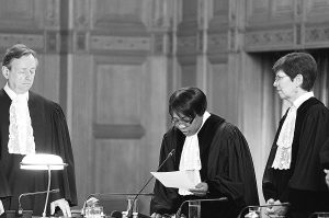 3月12日,现年58岁的乌干达籍女法官朱莉娅·塞布廷德(中)在海牙国际法院宣誓就任,成为继中国籍女法官薛捍勤和美国籍女法官琼·多诺霍之后的第三位国际法院现任非洲女法官。 新华社发