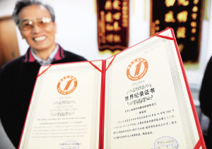 世界上服务时间最长的老年义工———李长河展示世界纪录证书(3月13日摄)。 青岛市军休二中心军休干部李长河从2002年起便开始做义工,至2011年7月累计志愿服务10272个小时。近日,他收到了世界纪录协会颁发并寄来的世界纪录证书,被认证为“世界上服务时间最长的老年义工”。 目前,李长河来到青岛市“天使温情空巢乐园”社工服务机构,每天为社区里的空巢老人理发,普及电脑科普知识,登门走访,嘘寒问暖。 新华社发