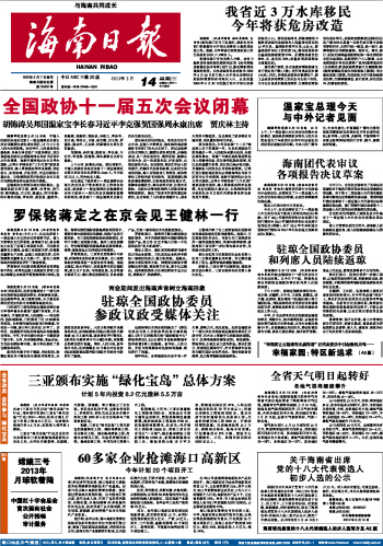 海南日报 头版 001 2012-03-141 2012年03月14日 星期三