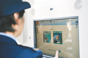北京 3月14日,在北京西单商业街明珠市场外,西城工商分局的一名工作人员在展示“消费者即时维权自助终端”。 日前,北京市西城工商分局在西单、大栅栏、什刹海、动物园这四大商业区使用“消费者即时维权自助终端”,消费者可通过该终端用视频方式,现场向工商部门投诉。 新华社发