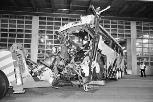 | 3月14日,在瑞士南部瓦莱州的谢尔,发生事故的大客车残骸停在一处厂房内。 新华社/法新 |