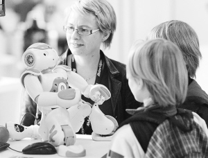 你好! 机器人 3月14日,在法国里昂举行的Innorobo机器人展会上,参观者观看展出的机器人。 Innorobo展会是一个以机器人为主题的展览会。该展出将于16日结束。 新华社/路透