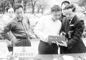 | 三月十五日,在海口望海国际广场门前,海口市烟草专卖局工作人员帮助市民鉴别香烟真假。 本报记者 苏晓杰 摄 |