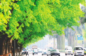 3月16日,海口市区路边树木枝头一片嫩绿。在“久别”多日的阳光照耀下,椰城春意盎然。 本报记者 张杰 摄