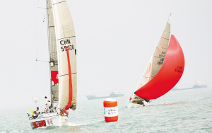 | 3月16日,“雅图号”和“浪骑号”在海口场地赛比赛中收球帆。 本报记者 宋国强 通讯员 何志成 摄 |